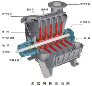機殼材料采用HT250鑄件,經(jīng)過時效和熱加工處理,保證強度及材料分子結(jié)構(gòu)的穩(wěn)定性。機殼的主要部件由進氣機殼、中間隔盤、排氣機殼組成,它們采用橡膠密封圈密封,并通過煤油滲漏試驗,保證氣體不泄露。葉輪出口處設有擴壓器,進口處設有回流器,保證鼓風機效率。為適應各種不同所需壓力和流量,鼓風機級數(shù)可采用2級-10級壓縮。進、出氣口位置根據(jù)用戶的需要,電機可以安裝在進氣端;也可以安裝在排氣端;法蘭面既可垂直向上,也可水平向左。