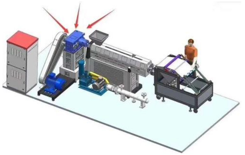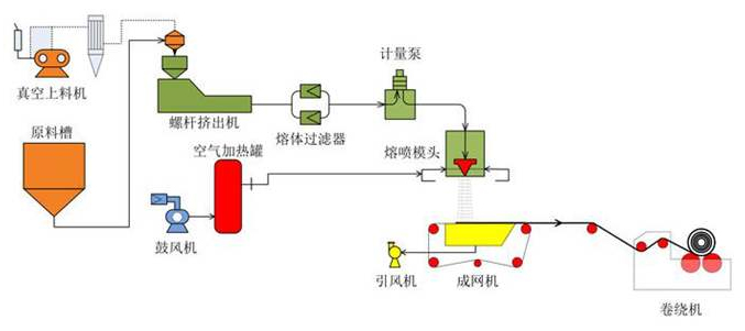 自動(dòng)上料機(jī)自動(dòng)吸入拉絲級(jí)聚丙稀送至擠出機(jī),擠出機(jī)加熱熔化PP顆粒至液態(tài)。羅茨鼓風(fēng)機(jī)或空壓機(jī)和儲(chǔ)氣罐壓縮空氣送至烘箱加熱,熱空氣通過(guò)壓力使熔化成液態(tài)的聚丙烯材料從噴頭噴射而出形成絲狀物(噴頭內(nèi)含數(shù)以百計(jì)的小孔)后,噴出的絲狀物水平到達(dá)接收設(shè)備,然后用滾壓機(jī)軋制無(wú)紡布。